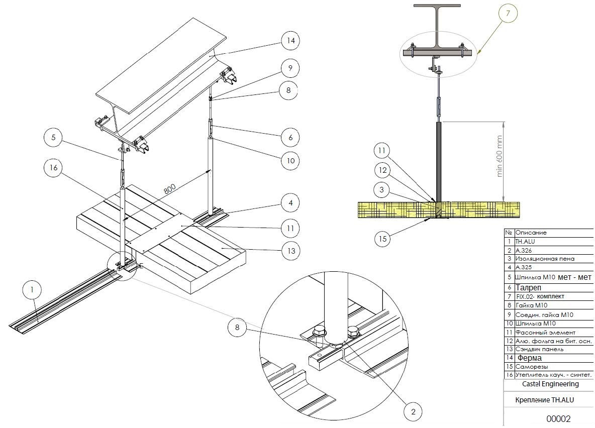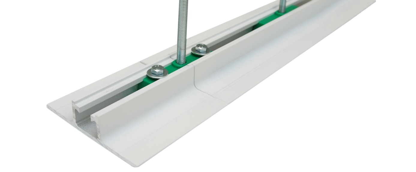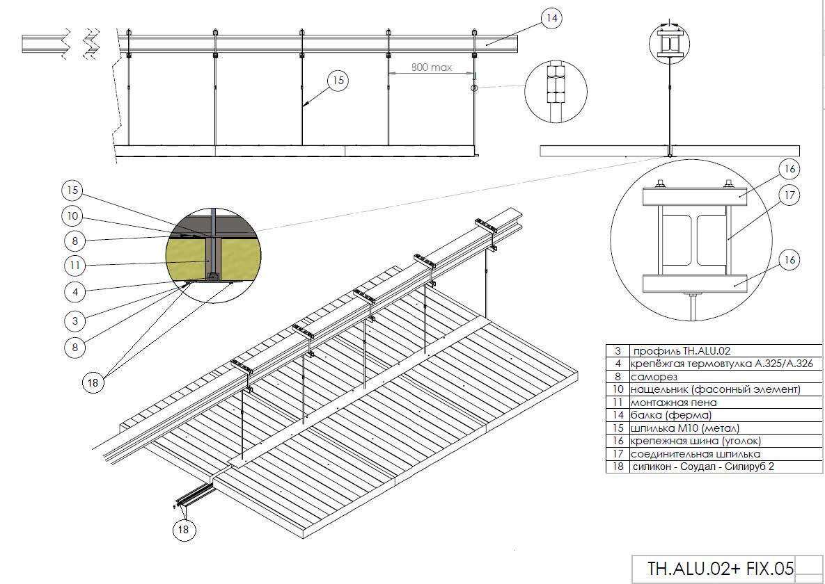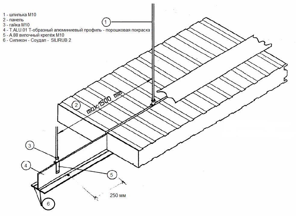 Панели потолка опираются торцевой частью на Т- профиль или омега-профиль TH.ALU. В зависимости от длины панелей рекомендуется устанавливать промежуточный подвес на специализированных ПВХ термокрепежах INJ.235 с металлической вставкой под шпильку M10 и уплотнительной ПВХ шайбой INJ.24 по длине панели.